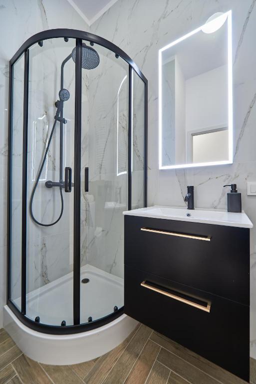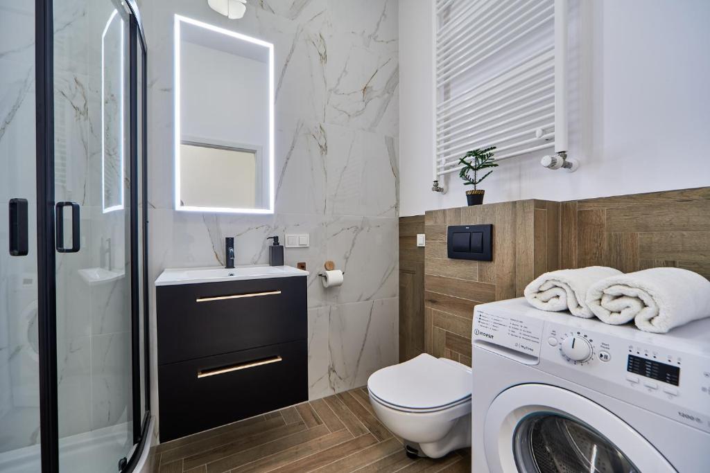 Łazienka: Elegancka i czysta, z prysznicem, pralką i suszarką do włosów. Dla Twojej wygody przygotowaliśmy świeże ręczniki i podstawowe kosmetyki do kąpieli.