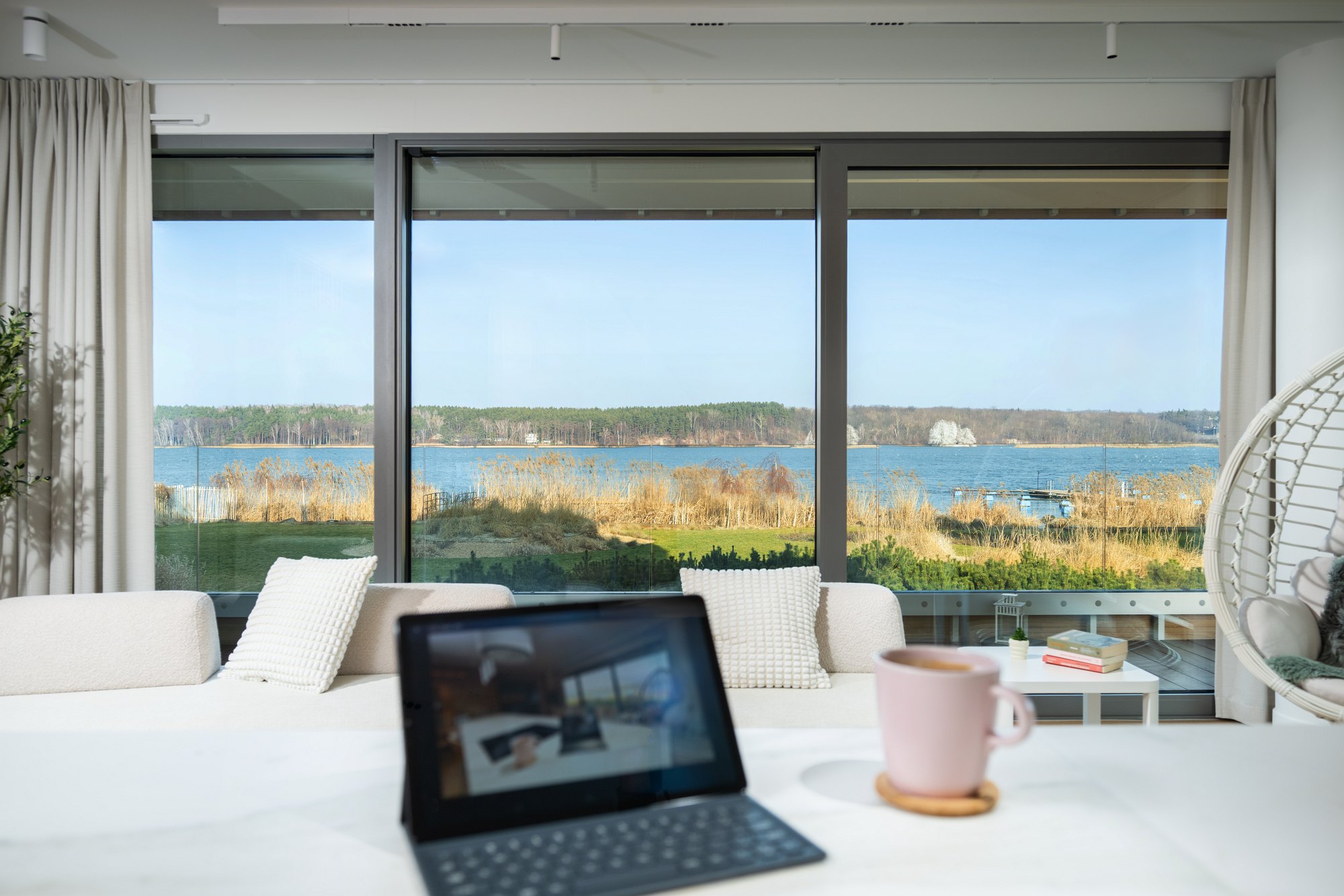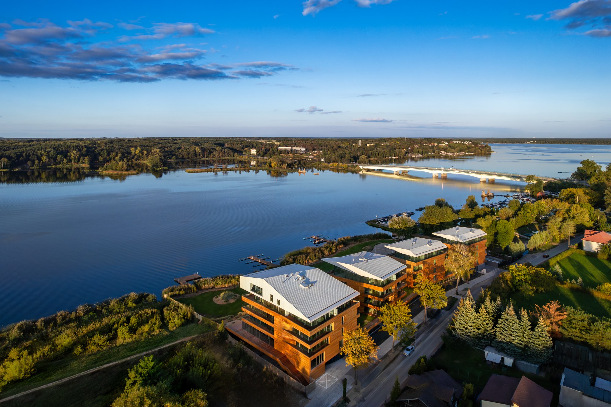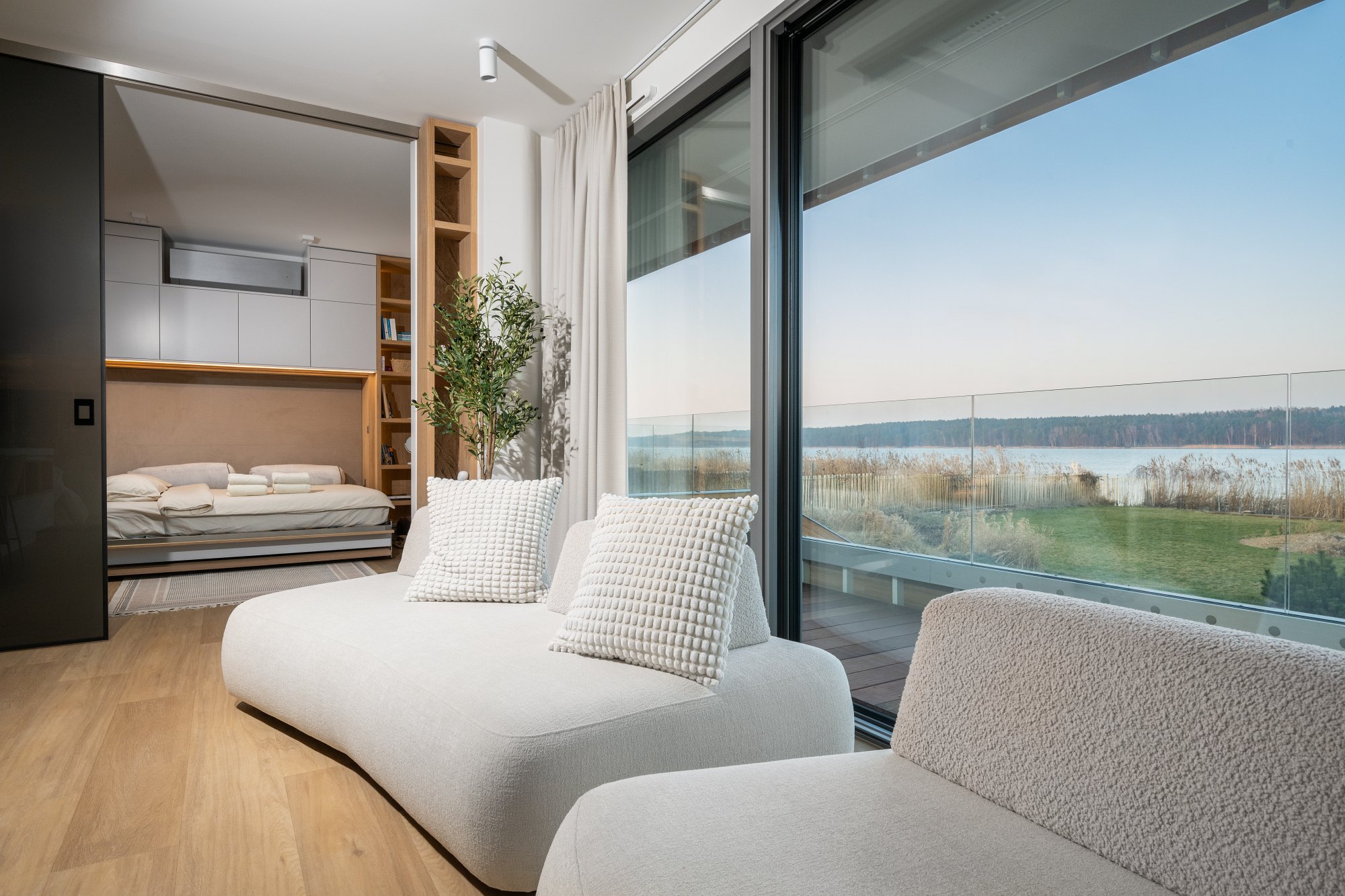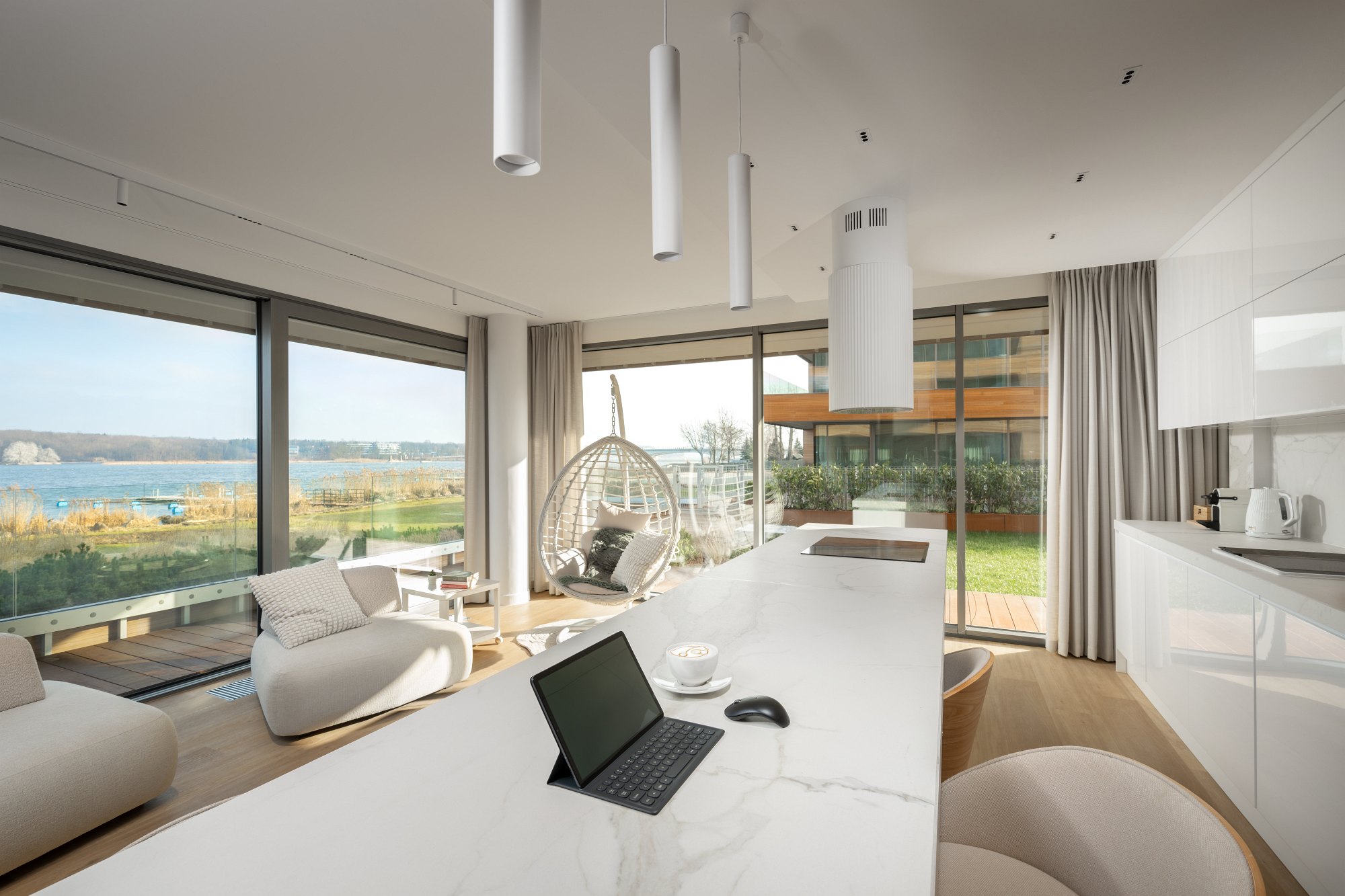Wyobraź sobie, że pracujesz w przestronnym biurze z panoramicznymi oknami, podziwiając jednocześnie piękną naturę, widoki na wodę, przelatujące ptaki. Po pracy możesz zrelaksować się na wygodnych leżakach na prywatnym tarasie, delektując się zachodem słońca. Jeśli wolisz aktywnie spędzać czas, skorzystaj z podgrzewnego basenu, siłowni lub wybierz się na spacer brzegiem zalewu.