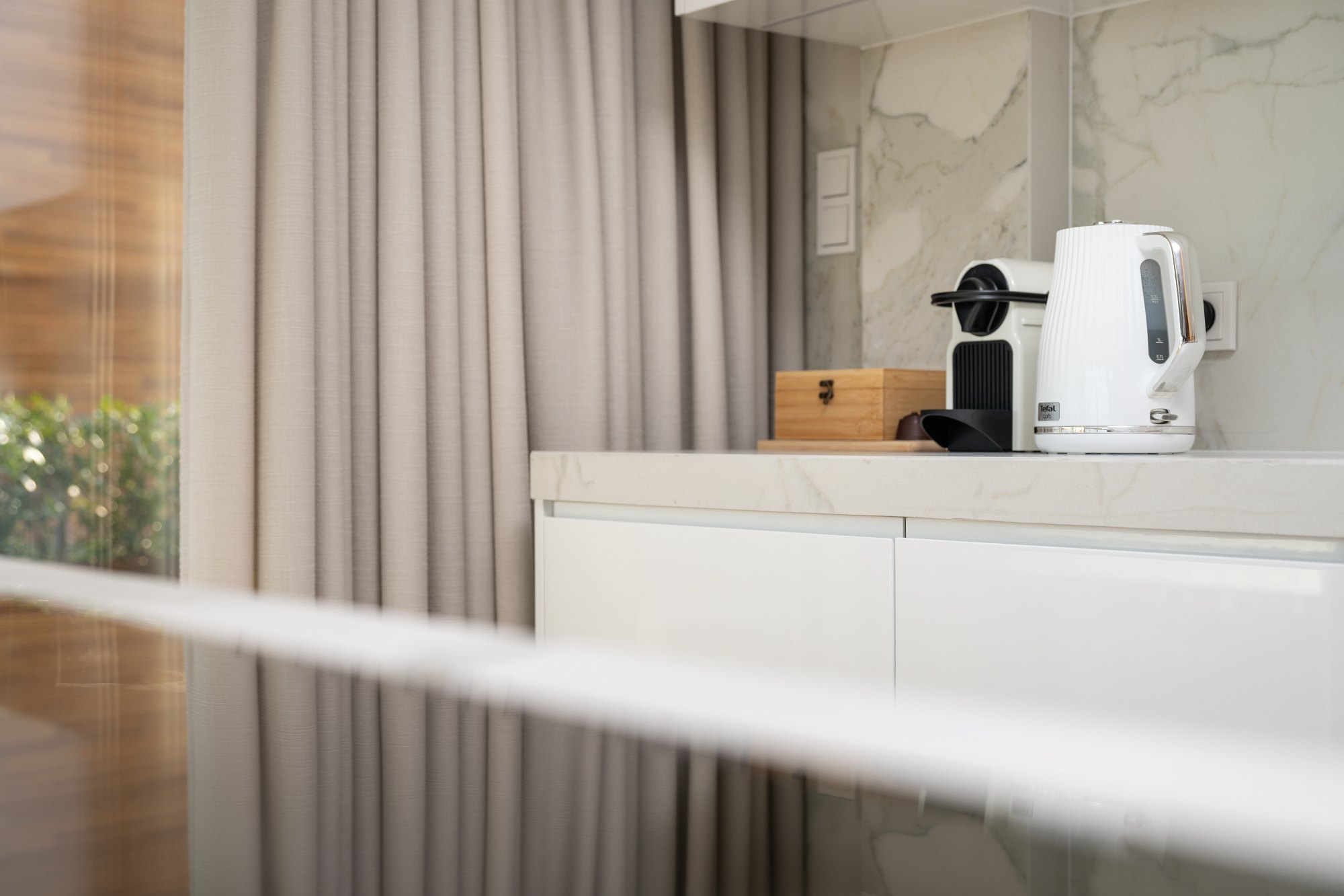 Apartament jest nowocześnie urządzony i w pełni wyposażony. Znajdziesz w nim wszystko, czego potrzebujesz, aby poczuć się jak w domu: wygodne łóżka, biuro, przestronną łazienkę, w pełni wyposażoną kuchnię, wygodne leżaki, pralkę, suszarkę i Wi-Fi. Na tym samym piętrze, w budynku znajduje się przeszklony, podgrzewany basen na który możesz przejść komfortowo, otulony w szlafroku.